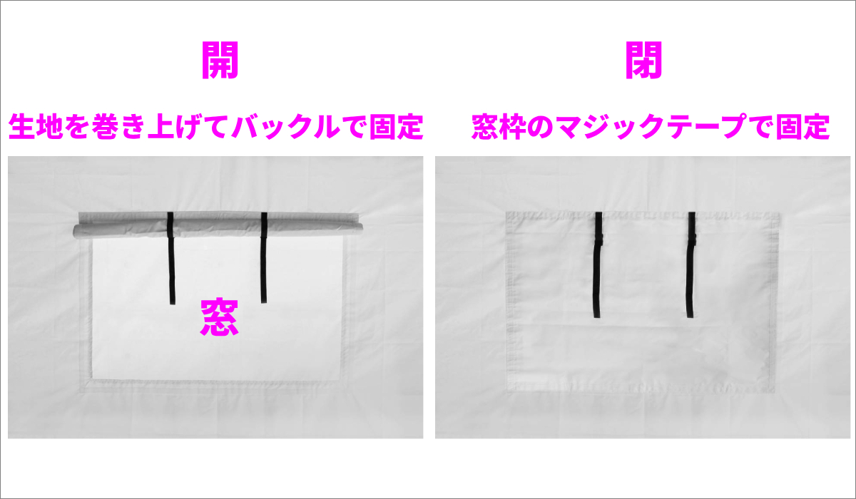 開閉用の生地と窓枠にマジックテープをプラスして、画像のように開閉できる仕様にもできます。