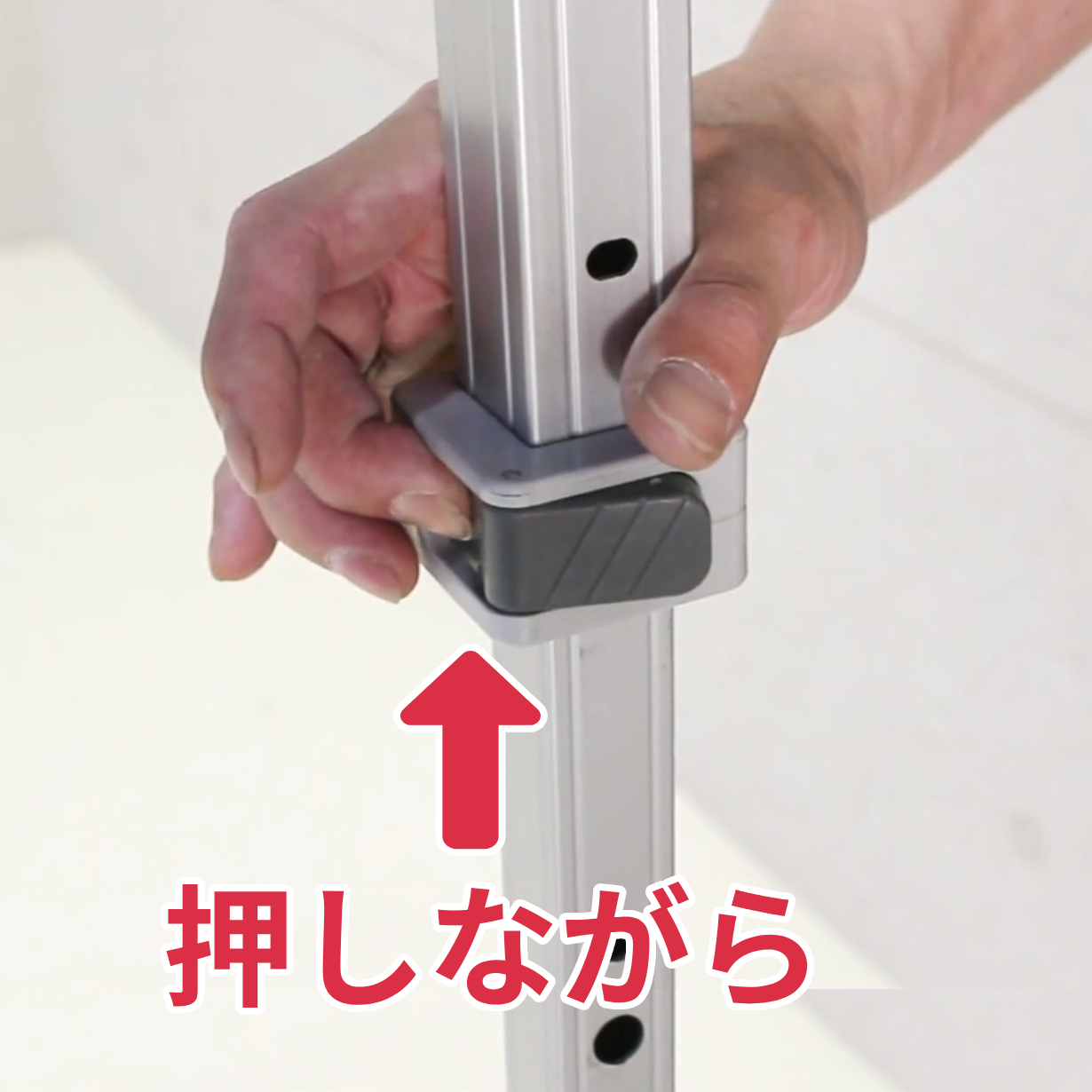 支柱真ん中のロックボタンを押しながら支柱を持ち上げ、地面に強く叩きつけてください。