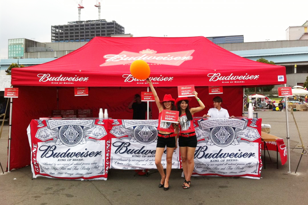 横幕を付けているイベントテントは、 企業でのイベント、防災用テント、医療用テントとして、個人向けではキャンプ・バーベキュー、海水浴といった屋外でのアウトドア・レジャー全般でよく見られます。