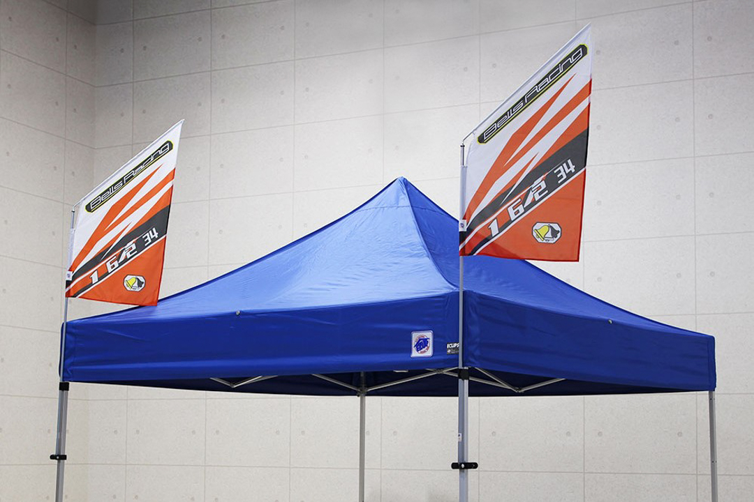 テントはプリントなしの無地ですが、コーナーフラッグを追加するだけで、お手持ちのテントがプロモーションツールへ早変わり。