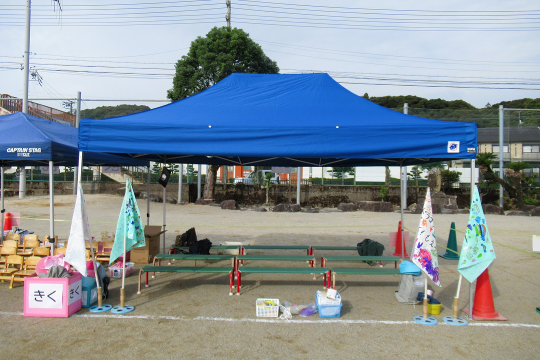 写真のように異なった天幕色でクラス分けなどをすると、児童を誘導しやすくなります。