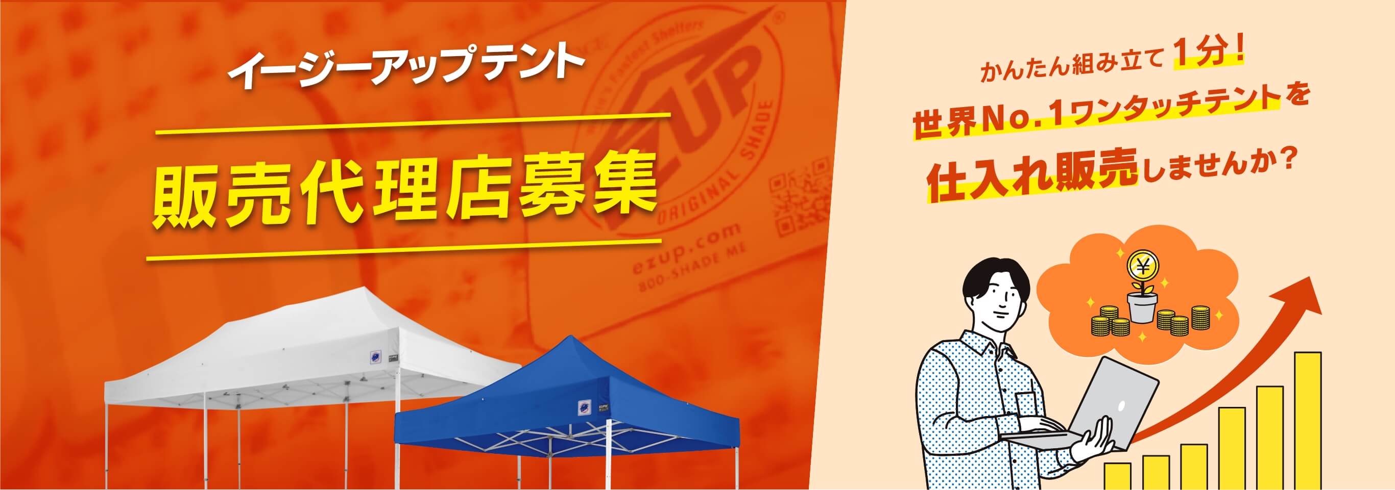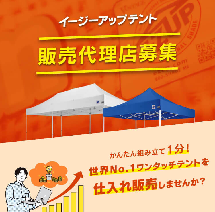 世界シェアNo.1のイージーアップテントは、たくさんのお客様にご使用・お取り扱いいただいております。その中でも特にご支持をいただいている理由をご紹介いたします! 世界で最初にワンタッチテントを開発 イージーアップテントは、1983年にアメリカで誕生し、40年弱の歴史あるテントです。日本では、弊社(株式会社来夢)が輸入元総代理店として25年以上正規輸入・販売しております。日本でもワンタッチテントはイージーアップが最初に展開している歴史があり、長年ワンタッチテントのパイオニアとして、世界シェアNo.1を走り続けてきた多くの実績があります。 生産を開始した初期の製品。利便性・耐久性など、常に改良され、現在も進化を続けています。 代理店・販売店の売上実績も豊富 世界だけでなく日本でもイージーアップテントをお取り扱いいただいている代理店・販売店様の年間売上は高い数値を上げられております。個人から企業まですべてのユーザーに最適なテントを提供できる本物のワンタッチテントのブランドだからこその信頼と実績から、イージーアップテントを多くの代理店、販売店様にお取り扱い頂いております。 ニーズに合わせた安心、便利な決済方法をご用意 クレジットカードだけでなく、NP掛け払い、Amazon Payなどの決済方法を取り扱っておりますので、代理店・販売店様の多様なニーズにお応えします。 NP掛け払いは、手続きなしで掛売り(請求書払い)ができる信頼の高い決済サービスで、法人、個人事業主の方ならどなたでもご利用いただけます。 今まで決済方法でお悩みだった方でも、安心、便利にお取引が可能です。 ※NP掛け払いはご注文後に与信審査があり、審査の結果ご利用いただけない場合がございます。 イージーアップテントについて詳しくみる テントの種類が豊富で様々なシーンで活躍する イージーアップテントは、様々な用途に合わせてお使いいただけるように、テントの価格帯やサイズ、素材、オプション品、プリントなどニーズに合わせたラインアップを豊富にご用意しております。実際に下記の利用シーンに関してのお問い合わせ・ご購入をいただいております。 医療・病院 感染症対策に! 販売代理店の一例 医薬品卸業者 部活・PTA 寄贈品・卒業記念に! 販売代理店の一例 事務用機器会社 文具用品店 スポーツ用品店 学校幼稚園・保育園 運動会・行事用の日よけに 販売代理店の一例 事務用機器会社 文具用品店 スポーツ用品店 飲食・販売店 イベント・物販用のブースとして! 販売代理店の一例 広告代理店 自動車用品店 イベント会社 企業 展示会ブース販売促進用プロモーションツール 販売代理店の一例 広告代理店 建材卸会社 印刷会社 スポーツチーム ベンチ・休憩所用テント 販売代理店の一例 広告代理店 スポーツ用品店 自転車販売店 町内会 行事・祭事用テント 販売代理店の一例 事務用機器会社 文具用品店 スポーツ用品店 自治体 防災テント・消防用テント 販売代理店の一例 広告代理店 イベント会社 事務用機器会社 文具用品店 スポーツ用品店 ご家庭 レジャー・バーベキュー 販売代理店の一例 アウトドア用品店 スポーツ用品店 ホームセンター 自動車用品店 導入事例をみる