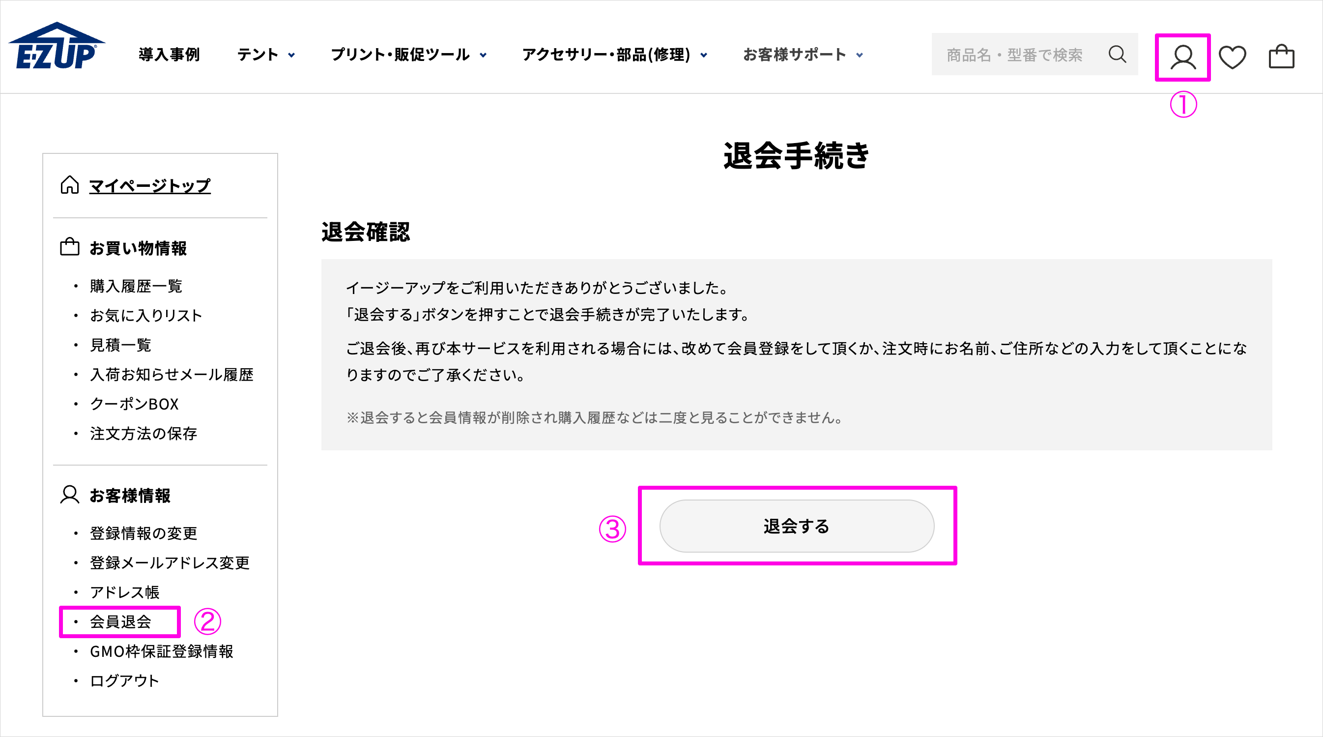 会員を退会された場合には、現在保存されている購入履歴や、お届け先などの情報は、すべて削除されます。■ マイページから退会手続きが可能です。