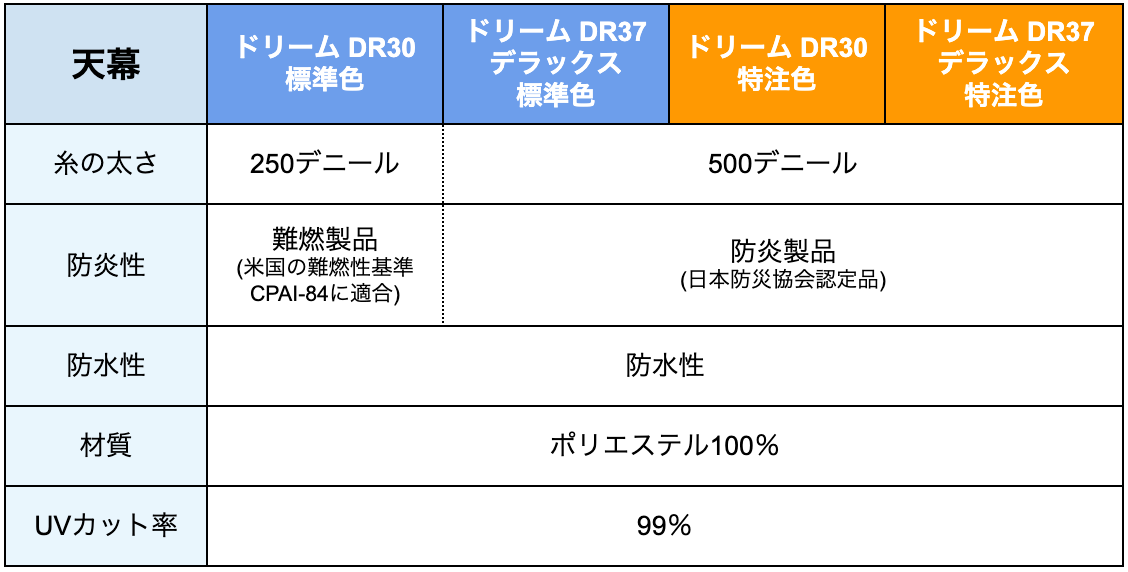 標準色は特注色より薄手で防炎製品ではありませんが、リーズナブルなメリットがあります。
