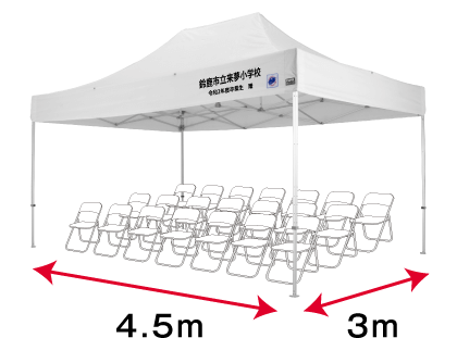 3m×4.5mのテントは、4本支柱タイプで一番大型の寄贈用テントです。3m×6mのようにテント中央に支柱がないため、卒業式の受付などでテーブルを置く際などに支柱が邪魔にならず人気のサイズです。