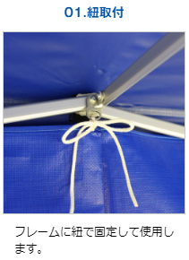 紐でフレームに結びます。連結用のファスナーはついておりませんが、手軽でリーズナブルな横幕です。